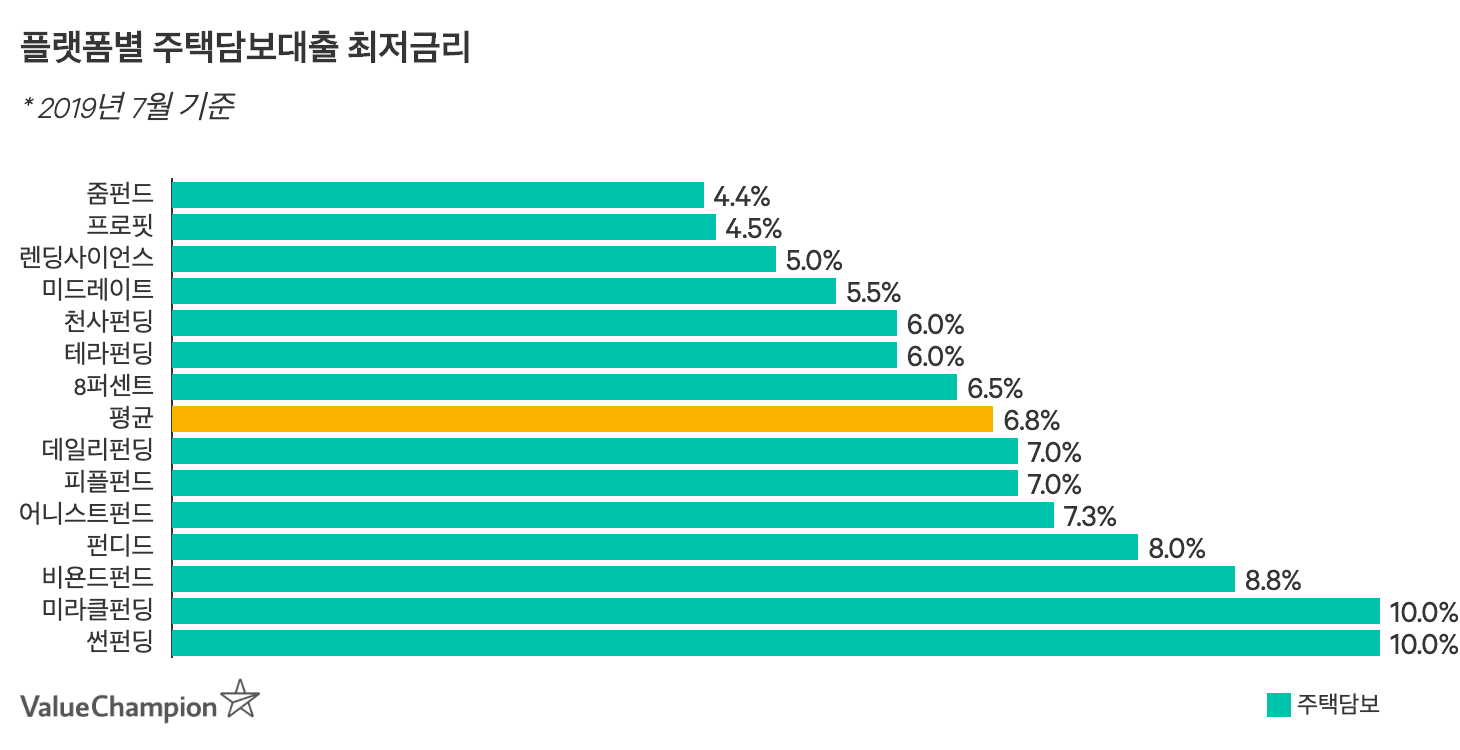 따라서 P2P 주택담보대출을 희망하시는 분을 위해 13군데의 P2P 플랫폼 대출 중 최저 금리를 제공하는 상품을 채택하였습니다. 밸류챔피언 추천 상품의 최저 금리는 4.40%로 P2P 플랫폼의 평균 금리인 6.80%보다 2%p 이상 차이가 납니다. 즉 2억원의 금액을 12개월간 대출 받으실 경우 약 500만원 상당의 이자 절약을 하실 수 있습니다.