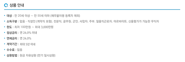 그리고 만 20세 이상 ~ 만 55세 이하분들이 이용가능한데요, 단 채무불이행 등록자는 제외가 됩니다. 소득구분또한 없는데요, 단, 신용평가가 가능한 무직자분들만 이용하실 수 있습니다. 최저 100만 ~ 최대 3,000만까지 연 24.0% 이내에서 이율이 발생이 됩니다.