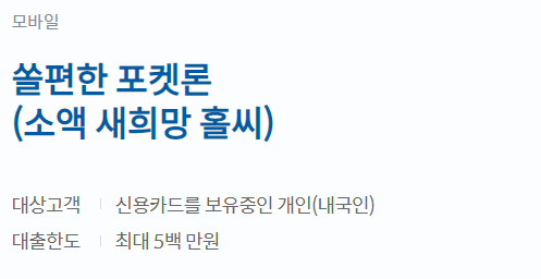 신용카드를 보유하고 있고 연체가 없으면 신청할 수 있는 대출입니다. 신한은행 모바일어플인 쏠(SOL)을 통해서만 신청이 가능하며 최대 500만원, 금리는 2.8%~7.2%로 적용됩니다.