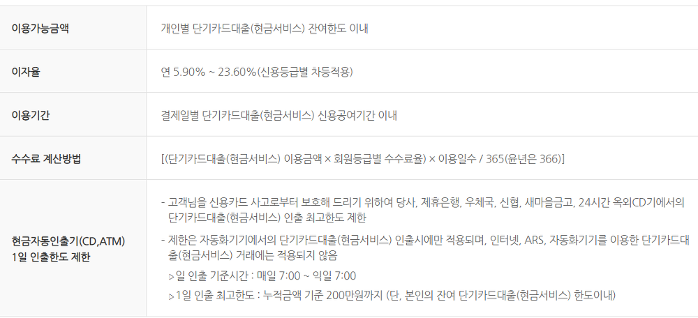 현금서비스 이자율은 연 5%~23% 사이이며 신용등급별로 차등적용됩니다. ATM기에서 하루 최다 대출한도는 200만원입니다.