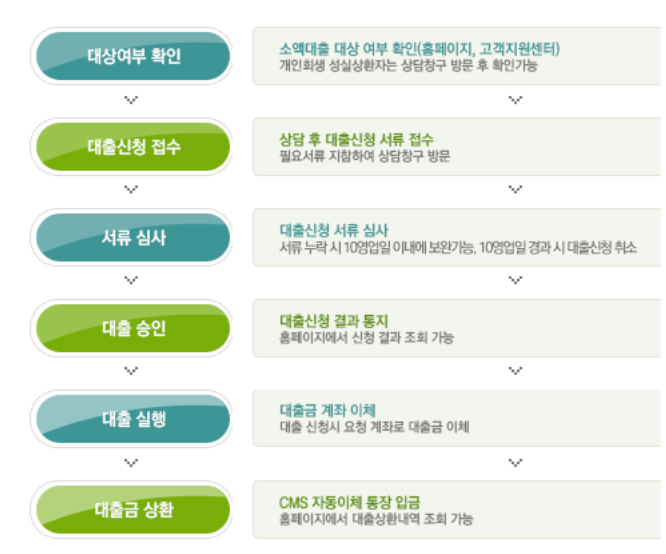 또한, 개인회생절차에 따라 변제계획을 24개월 이상 성실히 이행하거나 이행 완료 후 3년 이내인 자도 소액대출을 받을 수 있습니다.