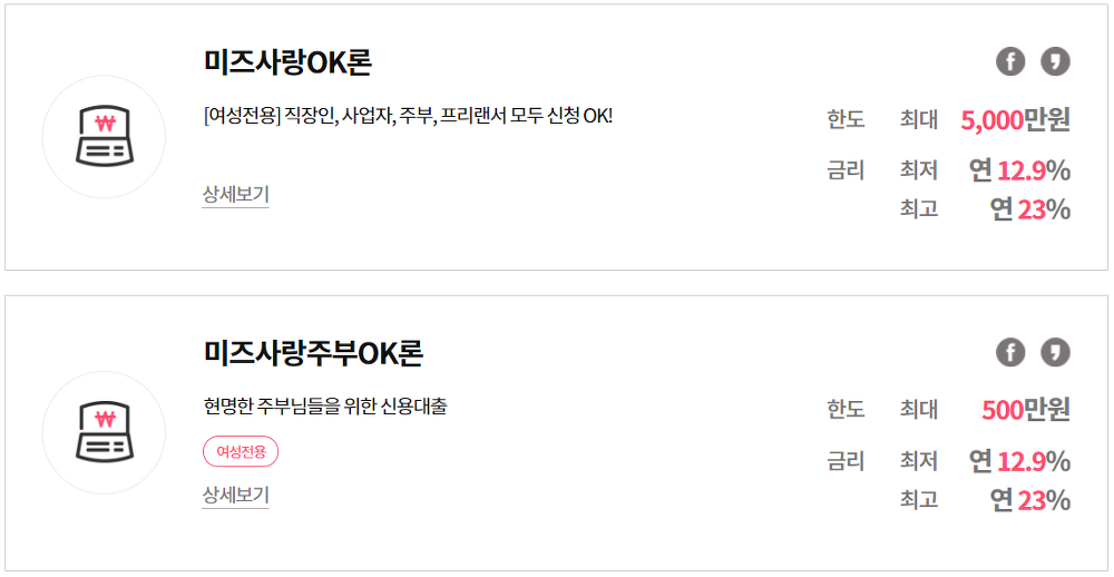 미즈사랑대출은 총 2개의 상품이 있습니다. 미즈사랑 OK론과 미즈사랑 주부OK론입니다.