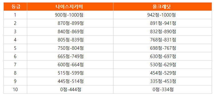 신용평가사인 나이스신용평가와 올크레딧에서 개인의 신용거래, 세금납부, 카드연체 등 다양한 기준을 종합하여 신용점수를 수치화 하여 등급을 나눈표로 기준은 아래와 같다.