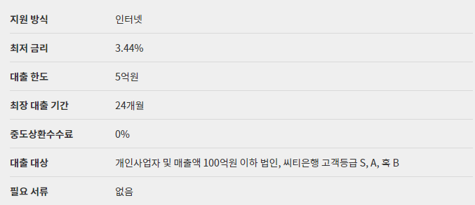 대출이 필요하신 개인사업자 분께서는 씨티은행 편한대출을 고려해 보세요. 이 상품의 최대 한도는 5억원으로 일반적으로 사업 자금이 많이 필요하신 개인사업자 분께 특화되었습니다. 더 나아가 최저금리도 3.44%로 매우 합리적이기 때문에 다른 대출 상품에 비해 5백만원 이상 절약 하실 수 있습니다. 비록 이 상품의 최대 대출기간은 24개월로 긴 편은 아니지만 업계 평균 상품보다 독보적으로 높은 한도를 가지고 있어 개인사업자 분께 적합한 대출입니다.