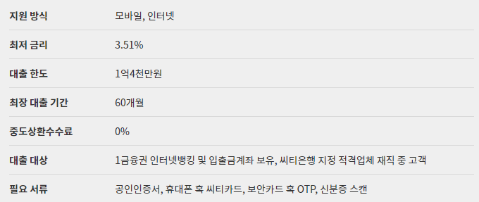 직장인 대출이 필요하신 분께 추천 드리는 씨티은행 온라인 직장인신용대출입니다. 이 상품은 조건에 따라 3.51%의 합리적인 최저금리로 1억4천만원의 높은 한도까지 대출을 제공합니다. 더 나아가 직장 및 경제 상황에 따라 대출 자격요건의 재직 기간이 최소 6개월로 낮아지기 때문에 최소 1년의 재직기간을 요구하는 일반적인 직장인 대출 상품에 비해 더 많으신 분께서 지원 가능합니다. 그럼에도 불구하고 중도상환수수료 면제 포로모션이 (~06/30/2019까지) 적용되기 때문에 모바일 혹 인터넷 지원 가능한 높은 금액의 대출을 원하시는 직장인 분께 특화 된 상품입니다.