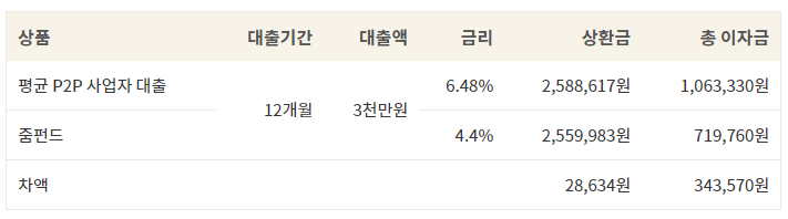 기존 금융기관보다 P2P 플랫폼에서 대출을 선호하시는 분을 위해 선정한 줌펀드 개인사업자 신용대출입니다. 이 상품은 사업유지기간이 6개월 이상이신 분 대상으로 대출을 제공하기 때문에 다수의 개인사업자 분께서 쉽게 대출 조건을 충족하실 수 있습니다. 비록 최대 대출 기간이 12개월로 짧은 편이지만 3천만원의 금액을 4.4%의 최저금리로 대출 가능합니다. 특히 일반적인 P2P 사업자 대출 상품의 금리가 6.48%이라는 점을 감안했을 때 이 상품의 금리는 더욱 부각됩니다. 따라서 P2P 대출을 희망하시는 개인사업자 분께 이상적인 상품입니다.
