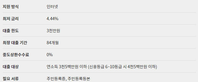 일반적인 직장인 대출 연소득 기준을 충족 못하시는 분께서는 부산 새희망홀씨II를 고려해 보세요. 구체적으로 연소득 3천5백만원 이하이신 (신용등급 6~10등급인 경우 4천5백만원 이하) 분께서는 최대 3천만원까지 대출을 받으실 수 있습니다. 더 나아가 이 상품의 최저 금리는 4.44%로 업계 평균보다 약 1%p 낮습니다. 따라서 최대 한도를 84개월 만기 상환 시 약 1백만원 이상의 절약을 하실 수 있기 때문에 소득이 높지 않으신 분께서는 이 상품을 선택하세요.
